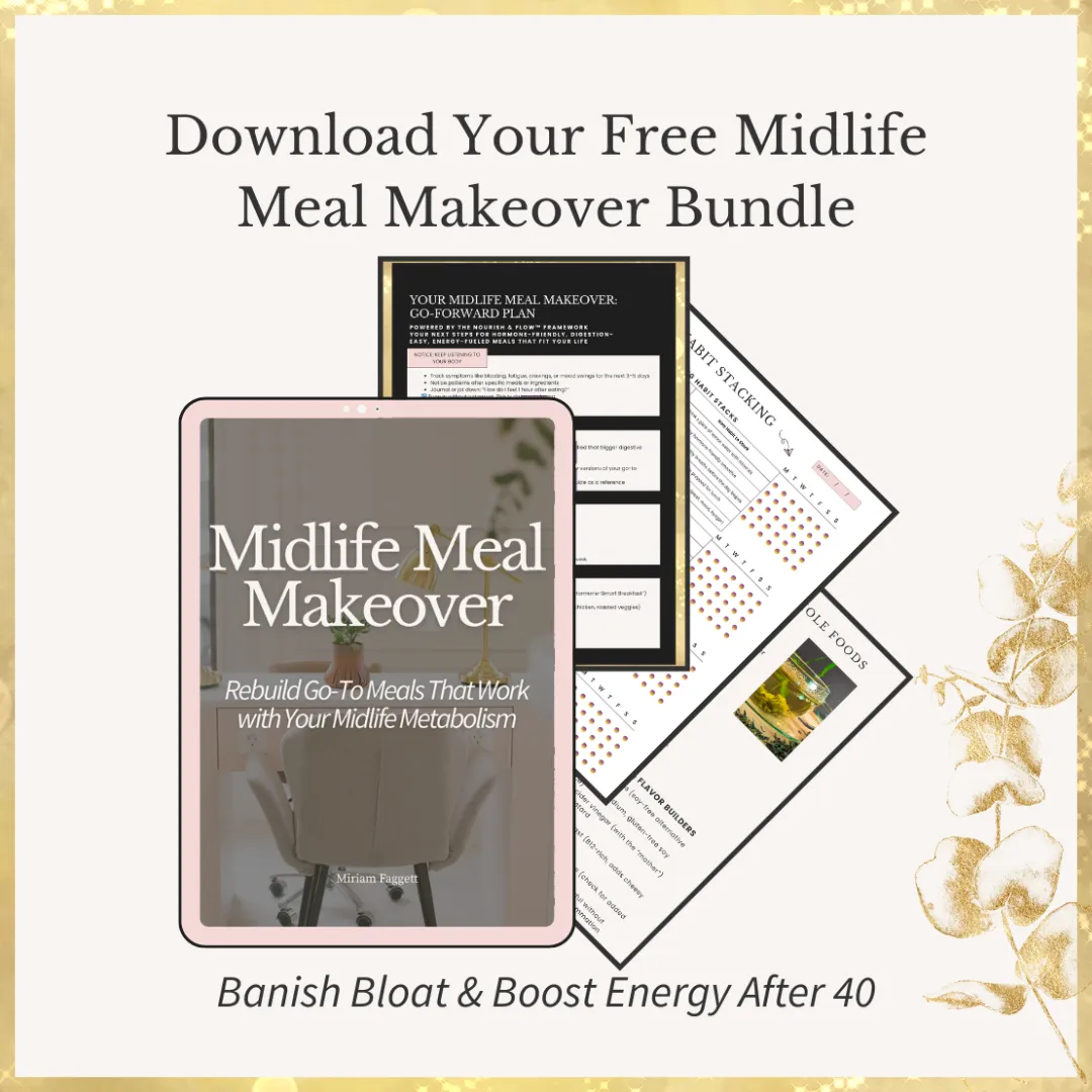 Don’t guess—get the exact steps to support digestion and hormones in midlife. My free bundle includes my pantry list, go-to meal tweaks, and more.
